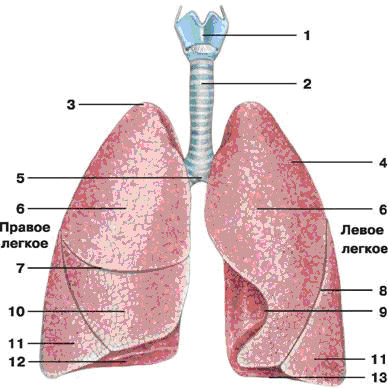 1 - гортань; 2 - трахея; 3 - верхушка легкого; 4 - реберная поверхность; 5 - раздвоение трахеи; 6 - верхняя доля легкого; 7 - горизонтальная щель правого легкого; 8 - косая щель; 9 - сердечная вырезка левого легкого; 10 - средняя доля легкого; 11 - нижняя доля легкого; 12 - диафрагмальная поверхность; 13 - основание легкого