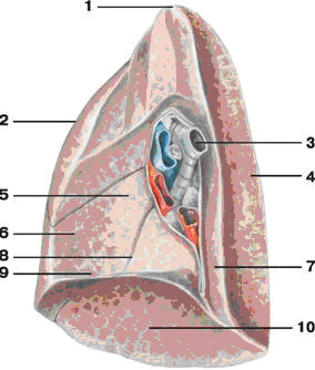 1 - верхушка легкого; 2 - верхняя доля; 3 - главный правый бронх; 4 - реберная поверхность; 5 - средостенная (медиастинальная) часть; 6 - сердечное вдавливание; 7 - позвоночная часть; 8 - косая щель; 9 - средняя доля; 10 - диафрагмальная поверхность