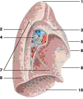 1 - корень легкого; 2 - реберная поверхность; 3 - средостенная (медиастинальная) часть; 4 - главный левый бронх; 5 - верхняя доля; 6 - сердечное вдавливание; 7 - косая щель; 8 - сердечная вырезка левого легкого; 9 - нижняя доля; 10 - диафрагмальная поверхность
