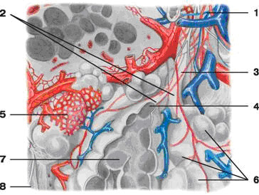 1 - бронхиола; 2 - альвеолярные ходы; 3 - дыхательная (респираторная) бронхиола; 4 - предсердие; 5 - капиллярная сеть альвеол; 6 - альвеолы легких; 7 - альвеолы в разрезе; 8 - плевра