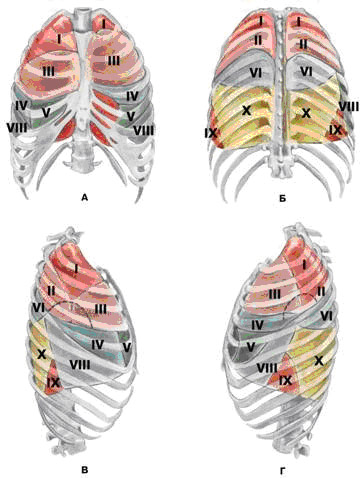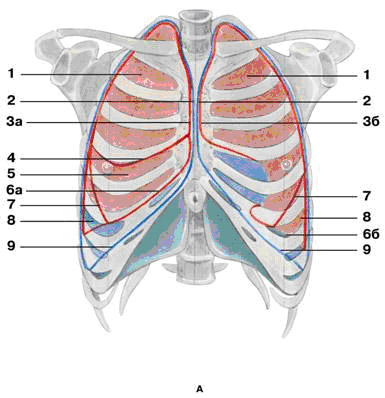 А - вид спереди: 1 - верхняя доля легкого; 2 - передняя граница плевры 3 - передний край легкого: а) правого; б) левого; 4 - горизонтальная щель; 5 - средняя доля; 6 - нижний край легкого: а) правого; б) левого; 7 - косая щель; 8 - нижняя доля; 9 - нижняя граница плевры;