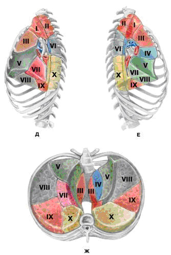 А - спереди; Б - сзади; В - справа; Г - слева; Д - изнутри и справа; Е - изнутри и слева; Ж - снизу: верхняя доля правого легкого: I - верхушечный сегмент; II - задний сегмент; III - передний сегмент; средняя доля правого легкого: IV - латеральный сегмент; V - медиальный легмент; нижняя доля правого легкого: VI - верхушечный (верхний) сегмент; VII - медиальный (сердечный) базальный сегмент; VIII - передний базальный сегмент; IX - латеральный базальный сегмент; X - задний базальный сегмент; верхняя доля левого легкого: I и II - верхушечно-задний сегмент; III - передний сегмент; IV - верхний язычковый сегмент; V - нижний язычковый сегмент; нижняя доля левого легкого: VI - верхушечный (верхний) сегмент; VII - медиальный (сердечный) базальный сегмент; VIII - передний базальный сегмент; IX - латеральный базальный сегмент; X - задний базальный сегмент