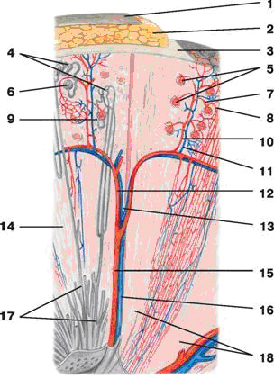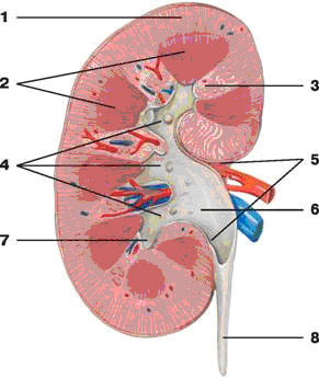1 - фасция почки; 2 - жировая капсула; 3 - волокнистая капсула; 4 - извитые канальцы; 5 - сосудистые клубочки; 6 - почечное тельце; 7 - приносящий сосуд; 8 - выносящий сосуд; 9 - двухслойная капсула; 10 - междольковая артерия; 11 - междольковая вена; 12 - дуговая артерия; 13 - дуговая вена; 14 - мозговое вещество почки; 15 - междолевая артерия; 16 - междолевая вена; 17 - сосочковые протоки; 18 - пирамиды почки