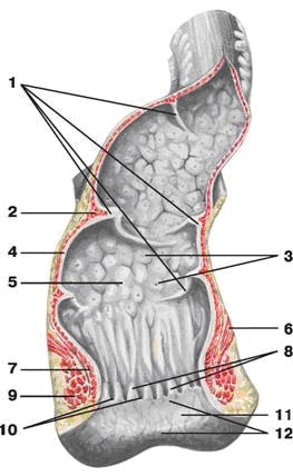1 - поперечные складки; 2 - мышечная оболочка; 3 - лимфатические фолликулы; 4 - слизистая оболочка; 5 - ампула прямой кишки; 6 - мышца, поднимающая задний проход; 7 - внутренний сжиматель заднего прохода; 8 - заднепроходные столбы; 9 - наружный сжиматель заднего прохода; 10 - заднепроходные пазухи; 11 - геморроидальная зона; 12 - заднепроходный анальный канал Вокруг заднего прохода круговые мышечные волокна образуют утолщение - непроизвольный внутренний сжиматель (сфинктер) заднего прохода (m. sphincter ani internus) (рис. 174), состоящий из гладких мышц.