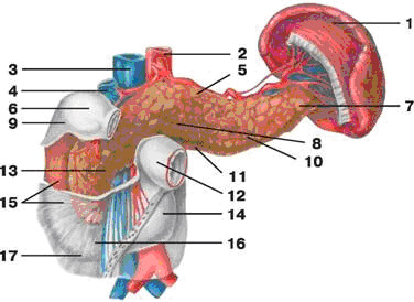 1 - селезенка; 2 - брюшная аорта; 3 - нижняя полая вена; 4 - воротная вена; 5 - верхний край поджелудочной железы; 6 - верхняя часть двенадцатиперстной кишки; 7 - хвост поджелудочной железы; 8 - тело поджелудочной железы; 9 - верхний изгиб двенадцатиперстной кишки; 10 - передний край поджелудочной железы; 11 - нижний край поджелудочной железы; 12 - тощая кишка; 13 - головка поджелудочной железы; 14 - нисходящая часть двенадцатиперстной кишки; 15 - восходящая часть двенадцатиперстной кишки; 16 - горизонтальная часть двенадцатиперстной кишки; 17 - нижний изгиб двенадцатиперстной кишки