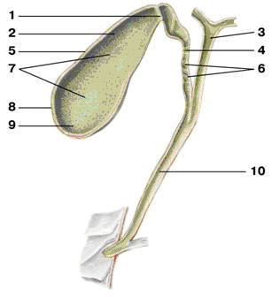 1 - шейка желчного пузыря; 2 - тело желчного пузыря; 3 - общий печеночный проток; 4 - пузырный проток; 5 - слизистая оболочка желчного пузыря; 6 - спиральные складки; 7 - мелкие складки слизистой оболочки желчного пузыря; 8 - мышечная оболочка желчного пузыря; 9 - дно желчного пузыря; 10 - общий желчный проток