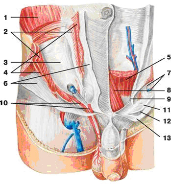 1 - наружная косая мышца живота; 2 - поперечная мышца живота; 3 - поперечная фасция; 4 - внутренняя косая мышца живота; 5 - прямая мышца живота; 6 - апоневроз наружной косой мышцы живота; 7 - глубокое паховое кольцо; 8 - пирамидальная мышца живота; 9 - паховый серп; 10 - мышца, поднимающая яичко; 11 - латеральная ножка паховой связки; 12 - поверхностное паховое кольцо; 13 - медиальная ножка паховой связки Канал имеет два отверстия: входное, которое называется глубоким паховым кольцом (anulus inguinalis profundus) (рис. 110), и выходное - поверхностное паховое кольцо (anulus inguinalis superficialis) (рис. 110). Поверхностное паховое кольцо располагается над лобковой костью в апоневрозе наружной косой мышцы живота и имеет вид овального отверстия, сверху ограниченного медиальной ножкой паховой связки (crus mediale) (рис. 110), а снизу - латеральной ножкой (crus laterale) (рис. 110). В этом отверстии пахового канала у мужчин располагается семенной канатик (funiculus spermaticus), у женщин - круглая связка матки (lig. teres uteri). Глубокое паховое кольцо находится в поперечной фасции живота и представляет собой не свободное отверстие, а воронкообразное углубление, медиально ограниченное межъямочковой связкой (lig. interfoveolare). Кнутри от межъямочковой связки волокна апоневроза поперечной мышцы живота, загибаясь и переплетаясь, крепятся к бугорку и гребню лобковой кости, образуя соединительное сухожилие, которое называется паховым серпом (falx inguinalis) (рис. 110). В области глубокого пахового кольца располагаются нижние надчревные вены и артерии.