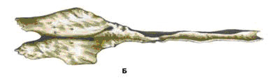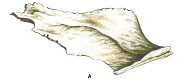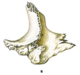 А - вид сбоку; Б - вид сверху Сошник (vomer) (рис. 88) представляет собой тонкую пластинку четырехугольной формы. Вместе с перпендикулярной пластинкой решетчатой кости принимает участие в образовании костной перегородки полости носа. Височно-нижнечелюстной сустав (articulatio temporomandibularis) парный, образован сочленением нижнечелюстной ямки и суставного бугорка височной кости с суставной поверхностью мыщелкового отростка нижней челюсти. Крепление капсулы осуществляется по краю суставных поверхностей при помощи боковой связки (lig. laterale), направляющейся от скулового отростка височной кости к шейке мыщелкового отростка нижней челюсти. С капсулой срастается суставной диск (discus articularis), который располагается в полости сустава, разделяя ее на верхний и нижний отделы. Форма сустава мыщелковая, движение осуществляется одновременно в обоих суставах. Опускание и поднимание нижней челюсти производится вокруг фронтальной оси. Между суставным диском и головкой нижней челюсти возможны незначительные по размаху движения, например во время речи. При сильном открывании рта головка нижней челюсти и суставной диск выходят на суставной бугорок височной кости. Выдвижение нижней челюсти осуществляется за счет скольжения головки нижней челюсти и суставного диска по суставной ямке и суставному бугорку височной кости. Смещение нижней челюсти в сторону обеспечивается вращением вокруг вертикальной оси головки нижней челюсти той стороны, в которую совершается движение, и выдвижением головки нижней челюсти противоположной стороны вместе с суставным хрящом.