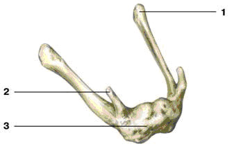 1 - большой рог; 2 - малый рог; 3 - тело подъязычной кости