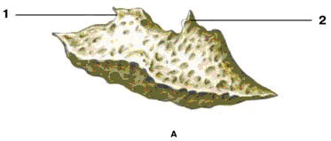 Слезная кость (os lacrimale) (рис. 85) представляет собой тонкую плоскую пластинку четырехугольной формы и образует передний отдел медиальной стенки глазницы. Вместе с лобным отростком верхней челюсти принимает участие в образовании ямки слезного мешка. Носовая кость (os nasale) (рис. 59, 86), соединяясь с одноименной костью противоположной стороны, формирует спинку носа. Нижняя носовая раковина (concha nasalis inferior) (рис. 87) представляет собой тонкую длинную пластинку, согнутую по оси. В ней выделяют верхнечелюстной отросток (processus maxillaris) (рис. 87), слезный отросток (processus lacrimalis) (рис. 87) и решетчатый отросток (processus ethmoidalis) (рис. 87). Один ее край прикрепляется к латеральной стенке полости носа, другой свободно свешивается в полость носа, разделяя средний и нижний носовые ходы.