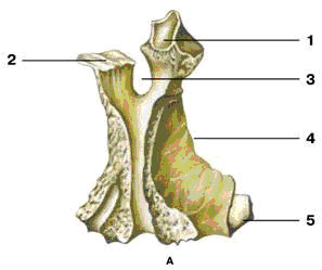 Рис. 82. Небная кость: А - вид снаружи; Б - вид изнутри: 1 - глазничный отросток; 2 - клиновидный отросток; 3 - клиновидно-небная вырезка; 4 - перпендикулярная пластинка; 5 - горизонтальная пластинка