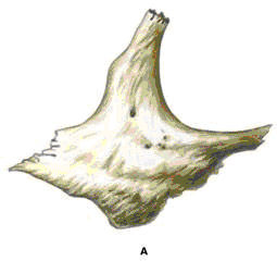 Перед вырезкой находится острый венечный отросток (processus corocoideus) (рис. 79, 81), а позади нее отходит мыщелковый отросток (processus condylaris) (рис. 79, 81). В области угла нижней челюсти на наружной поверхности находится жевательная бугристость (tuberositas masseterica) (рис. 79), а на внутренней - крыловидная бугристость (tuberositas pterygoidea) (рис. 80). Обе являются местом крепления одноименных мышц.