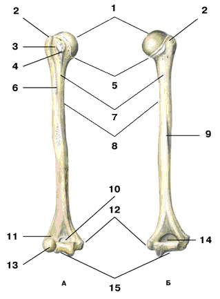 А - вид спереди; Б - вид сзади: 1 - головка плечевой кости; 2 - большой бугорок; 3 - межбугорковая борозда; 4 - малый бугорок; 5 - анатомическая шейка; 6 - дельтовидная бугристость; 7 - хирургическая шейка; 8 - тело плечевой кости; 9 - борозда лучевого нерва; 10 - венечная ямка; 11 - лучевая ямка; 12 - медиальный надмыщелок; 13 - головка мыщелка; 14 - ямка лучевого отростка; 15 - блок плечевой кости