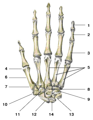 1 - дистальная фаланга; 2 - средняя фаланга; 3 - проксимальная фаланга; 4 - головка пястной кости; 5 - пястные кости; 6 - тело пястной кости; 7 - основание пястной кости; 8 - головчатая кость; 9 - крючковидная кость; 10 - кость-трапеция; 11 - трапециевидная кость; 12 - ладьевидная кость; 13 - трехгранная кость; 14 - полулунная кость