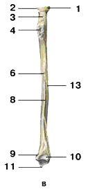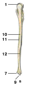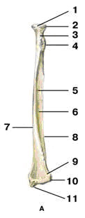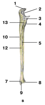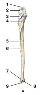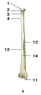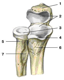 1 - локтевой отросток; 2 - блоковидная вырезка; 3 - суставная окружность локтевой кости; 4 - венечный отросток; 5 - шейка лучевой кости; 6 - бугристость лучевой кости; 7 - бугристость локтевой кости