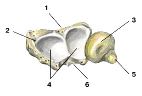 1 - передняя часть; 2 - шиловидный отросток лучевой кости; 3 - головка локтевой кости; 4 - запястная суставная поверхность; 5 - шиловидный отросток локтевой кости; 6 - задняя часть