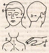 4. Точка шан-син. Находится на средней линии головы на 1 цунь выше передней границы роста волос. Ее массируют в положении сидя.