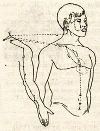 Ход меридиана тройного обогревателя. Меридиан, связанный с тройным обогревателем и перикардом, начинается на кончике безымянного пальца кисти и проходит по наружной стороне предплечья. Далее он поднимается к плечевому суставу и поворачивает к надключичной ямке. Отсюда канал движется вдоль шеи и достигает заушной области, где от него отходит вторая ветвь.
