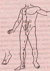 К группе седативных точек принадлежит также жань-гу (R2), локализованная во впадине на границе тыльной и подошвенной поверхностей стопы, в центре нижнего края ладьевидной кости. На нее воздействуют в случае опухания суставов стопы, потери речи, слюнотечения, рвоты, кровохарканья, при ларингите, тонзиллите, лихорадке, инфекции мочевыводящих путей, зуде наружных половых органов, энурезе, бесплодии, сахарном диабете.