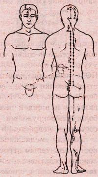 Первая ветвь спускается по позвоночнику на расстоянии 1,5 цунь от средней линии и, достигнув области ягодиц, поднимается к крестцу. Затем эта ветвь движется по задней поверхности бедра и доходит до середины подколенной складки — точки вэй-чжун (V40). В этой точке она соединяется со второй ветвью. После этого меридиан проходит по задней поверхности голени, огибая лодыжку, сворачивает на стопу и движется по ее наружному краю. Заканчивается канал мочевого пузыря у бокового края основания ногтя мизинца стопы.
