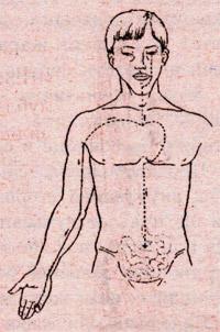 Меридиан сердца связан также с тонким кишечником, почками и легкими. Начинаясь от сердца, он проходит через диафрагму и достигает тонкого кишечника. Дополнительная ветвь меридиана отходит от сердца и поднимается вверх по пищеводу. Основная ветвь также следует от сердца и, проходя через легкие, проникает в подмышечную впадину, а затем движется по внутренней поверхности руки. Заканчивается канал у бокового края основания ногтя мизинца руки.