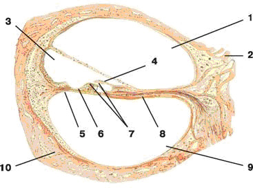 Перепончатый лабиринт (labyrinthus membranaceus) (рис. 293) по своей форме и структуре совпадает с формой костного лабиринта и отличается только по размеру, так как располагается внутри костного. Промежуток между костным и перепончатым лабиринтами заполнен перилимфой, а полость перепончатого лабиринта - эндолимфой. Стенки перепончатого лабиринта образуются соединительно-тканным слоем, основной мембраной и эпителиальным слоем. Рис. 292. Перепончатый лабиринт (разрез через основной завиток улитки):