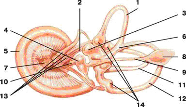 1 - передний перепончатый полукружный проток; 2 - нерв маточки; 3 - маточка; 4 - мешочек; 5 - перепончатая улитка (улитковый проток); 6 - общая перепончатая ножка; 7 - улитковый нерв; 8 - эндолимфатический мешок; 9 - эндолимфатический проток; 10 - нерв мешочка; 11 - боковой перепончатый полукружный проток; 12 - задний перепончатый полукружный проток; 13 - нервы ампул; 14 - ампулярные концы перепончатых полукружных протоков Перепончатая улитка, которая также называется улитковым протоком (ductus cochlearis) (рис. 292, 293), включает в себя периферические аппараты улиткового нерва (n. cochlearis) (рис. 293). На базилярной пластинке (lamina basilaris) (рис. 292) улиткового протока, которая является продолжением костной спиральной пластинки, находится выступ нейроэпителия, носящий название спирального или кортиева органа (organum spirale) (рис. 292). Он состоит из опорных и эпителиальных клеток, располагающихся на основной мембране. К ним подходят нервные волоконца - отростки нервных клеток основного ганглия. Именно кортиев орган отвечает за восприятие звуковых раздражений, так как нервные отростки представляют собой рецепторы улитковой части преддверно-улиткового нерва. Над спиральным органом располагается покровная мембрана (membrana tectoria) (рис. 292).