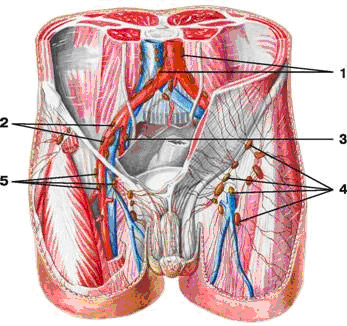1 - поясничные лимфатические узлы; 2 - наружные подвздошные лимфатические узлы; 3 - внутренние подвздошные лимфатические узлы; 4 - поверхностные паховые лимфатические узлы; 5 - глубокие паховые лимфатические узлы Внутренностные узлы обслуживают внутренние органы и подразделяются на околопрямокишечные, околомочепузырные, околовлагалищные и околоматочные. Лимфатические сосуды, направляющиеся от мочевого пузыря, несут лимфу к наружным и внутренним подвздошным, поясничным (nodi lymphatici lumbales) (рис. 239) и крестцовым (nodi lymphatici sacrales) лимфатическим узлам. Лимфа от влагалища и матки собирается в поясничных узлах, поверхностных паховых узлах, наружных и внутренних крестцовых и подвздошных лимфатических узлах. От яичка и простаты лимфа поступает в поясничные узлы, наружные и внутренние подвздошные лимфатические узлы. Поверхностные паховые лимфатические узлы принимают лимфу от наружных половых органов. Выносящие сосуды наружных и внутренних подвздошных узлов направляются к общим подвздошным лимфатическим узлам, из которых лимфа попадает в поясничные узлы.