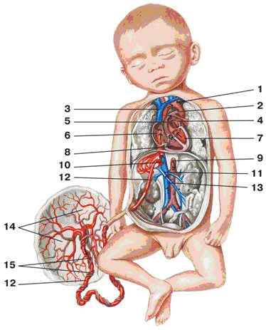 1 - дуга аорты; 2 - артериальный проток; 3 - верхняя полая вена; 4 - левое предсердие; 5 - легочный ствол; 6 - правое предсердие; 7 - левый желудочек; 8 - правый желудочек; 9 - брюшная аорта; 10 - венозный проток; 11 - воротная вена; 12 - пупочная вена; 13 - нижняя полая вена; 14 - плацента; 15 - пупочные артерии От брюшной аорты отходят две пупочные артерии (aa. umbilicales) (рис. 238), по которым часть крови из тела зародыша попадает в плаценту, где происходит ее очищение от углекислоты и продуктов обмена. Чистая артериальная кровь по пупочной вене снова попадает в тело плода. В момент рождения, после перерезания пуповины, связь плода с телом матери нарушается, и после первого вздоха легкие и их сосуды расправляются, что приводит к началу функционирования малого круга кровообращения. В левой половине сердца ребенка повышается давление, пупочные вены и артерии запустевают, овальное отверстие закрывается заслонкой, в результате чего прекращается сообщение между предсердиями. Позднее овальное отверстие, венозный и артериальные протоки полностью зарастают, и устанавливается кровообращение, свойственное организму взрослого человека.