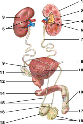 1 - левая почка; 2 - корковое вещество; 3 - правая почка; 4 - почечные пирамиды; 5 - ворота почки; 6 - почечная лоханка; 7 - левый мочеточник; 8 - верхушка мочевого пузыря; 9 - дно мочевого пузыря; 10 - тело мочевого пузыря; 11 - семенной пузырек; 12 - предстательная железа; 13 - тело полового члена; 14 - корень полового члена; 15 - семявыносящие протоки; 16 - придаток; 17 - головка полового члена; 18 - яичко; 19 - дольки яичка