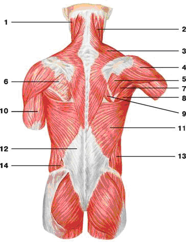 1 - грудино-ключично-сосцевидная мышца; 2 - ременная мышца головы; 3 - трапециевидная мышца; 4 - дельтовидная мышца; 5 - подостная мышца плеча; 6 - подостная фасция; 7 - малая круглая мышца; 8 - большая круглая мышца; 9 - большая ромбовидная мышца; 10 - трехглавая мышца плеча; 11 - широчайшая мышца спины; 12 - грудопоясничная фасция; 13 - наружная косая мышца живота; 14 - внутренняя косая мышца живота