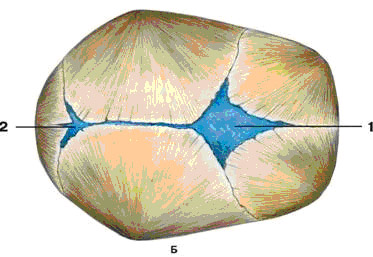 А - вид сбоку; Б - вид сверху: 1 - большой родничок; 2 - малый родничок; 3 - клиновидный родничок; 4 - сосцевидный родничок Главной отличительной особенностью черепа новорожденного является наличие родничков. Роднички - это неокостеневшие участки перепончатого черепа (desmocranium), которые располагаются в местах формирования будущих швов. На первых этапах развития плода крыша черепа представляет собой перепончатое образование, покрывающее головной мозг. На 2–3-м месяце, минуя стадию хряща, формируются костные ядра, которые впоследствии сливаются друг с другом и образуют костные пластинки, то есть костную основу костей крыши черепа. К моменту рождения между сформировавшимися костями сохраняются участки узких полос и более широких пространств - родничков. Именно благодаря этим участкам перепончатого черепа, способным западать и выпячиваться, происходит существенное смещение самих костей черепа, что обеспечивает возможность прохождения головы плода по узким местам родовых путей.