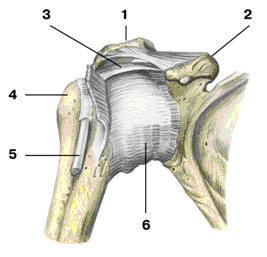 1 - акромион лопатки; 2 - клювовидный отросток лопатки; 3 - клювовидно-плечевая связка; 4 - большой бугорок плечевой кости; 5 - сухожилие длинной головки двуглавой мышцы плеча; 6 - капсула сустава