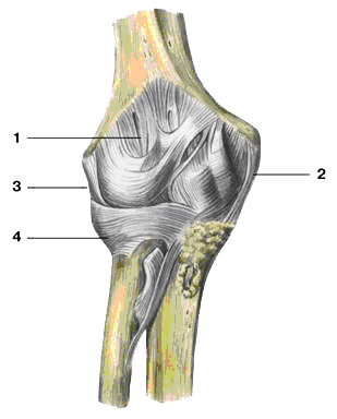 1 - суставная капсула; 2 - локтевая коллатеральная связка; 3 - лучевая коллатеральная связка; 4 - кольцевая связка лучевой кости