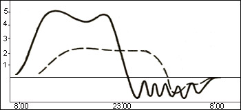 Сплошная линия - здоровый человек; пунктир - человек с нарушенным сном.