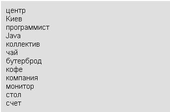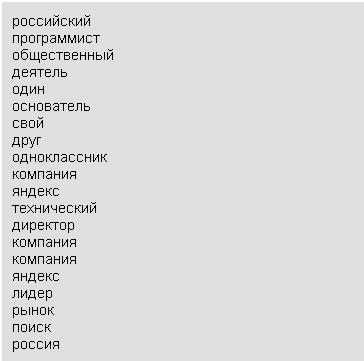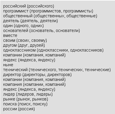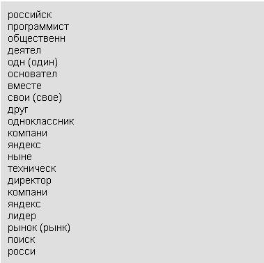 (Для программистов: читайте внимательно, я начинаю частично описывать действия, которые должны находить свое отображение в программе) 1. Возьмите какой-нибудь абзац текста, например: Илья Валентинович Сегалович — российский программист и общественный деятель, один из основателей (вместе со своим другом и одноклассником Аркадием Воложем) компании «Яндекс», ныне технический директор компании. Компания «Яндекс» — лидер на рынке поиска в России. 2. Выкидываем (Илья и Аркадий, уж простите) из абзаца имена собственные, например, пользуясь словарем имен собственных, получаем: российский программист и общественный деятель, один из основателей (вместе со своим другом и одноклассником) компании «Яндекс», ныне технический директор компании. Компания «Яндекс» — лидер на рынке поиска в России. 3. Убираем все стоп-слова (заведите себе словарик стоп-слов), предлоги, союзы и др: российский программист общественный деятель, один основателей (вместе своим другом одноклассником) компании «Яндекс», ныне технический директор компании. Компания «Яндекс» — лидер рынке поиска России. 4. Запятые, точки, тире, черточки, двоеточия, скобки, елочки, циферки заменяем на пробелы, двойные пробелы удаляем: российский программист общественный деятель один основателей вместе своим другом одноклассником компании Яндекс ныне технический директор компании Компания Яндекс лидер рынке поиска России Имеем еще вполне осмысленный набор слов. Пишем слова в столбик, приводим в один регистр и приводим рядом пару-тройку однокоренных слов (для сравнения):