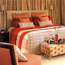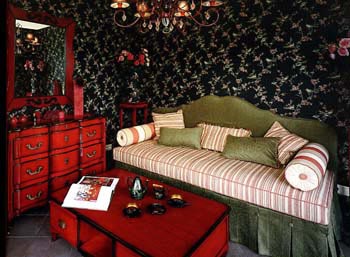 Популярны сочетания рисунчатых тканей с полосатыми и клетчатыми: если мебель обтянута более активной орнаментированной тканью, но подушки лучше подбирать в полоску или клетку, и наоборот. Среди узорных материалов очень хороши для подушек и те, что имеют характерный "мебельный" рисунок: картуши, архитектурные детали и т.д. Такие ткани удачно сочетаются с классическими полосами, в том числе и с полосатыми обоями.