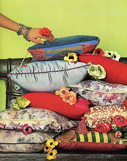 Вошла в моду и отделка валиками, при которых интересно сопоставляются объемы - например, плосковатая подушка и выпуклый валик вокруг нее из той же или сходной ткани и расцветки. Все эти прикрасы придают подушкам эксклюзивность - теперь это уже не просто "четыре ушка - два брюшка", а полноправная деталь интерьера.