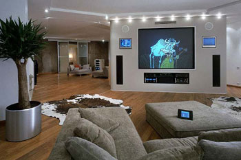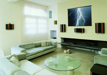 А проектор можно подвесить под потолком либо тоже убрать в специальную нишу. Большой экран телевизора или плазменную панель можно поместить в специально отведенное место в корпусной мебели и закрыть дверцами. Экраны, на которые изображение формируется с помощью проектора могут быть выдвижными, а в свернутом состоянии они представляют собой подобие гардины. Но на время просмотра с помощью дистанционного управления экран можно развернуть, и тогда он займет часть стены, простенок между окнами или закроет собой стеллаж.
