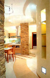 Особо следует сказать о колоннах. Нередко колонны в квартирах - неизбежность, которую можно превратить в украшение интерьера. Стройные колонны создают ощущение объема, а плавная линия арочного свода оттенит зону кухни, придаст ей камерность. В современном интерьере вынужденная колонна между кухней и столовой может быть эффектно обыграна островом: со стороны кухни - технологичная часть, а со стороны обеденной зоны - дополнительные места для приема пищи, что-то вроде барной стойки, используемой для быстрой еды.