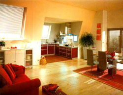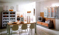 Самое элементарное зонирование пространства кухни и столовой - пол, который является неотъемлемой частью дизайна кухни. Переход из активной зоны в обеденную должен быть продуман особенно тщательно, чтобы каждая зона выглядела естественным продолжением интерьера. Относительно напольного покрытия (об основных его видах мы уже писали) откровенного диктата не существует. Интересные художественные и в то же время практичные решения дает комбинация материалов. Например, если в качестве основного покрытия выбирается паркет, то в рабочей зоне пол выкладывается плиткой или керамогранитом. Если выбирается один материал, то зоны визуально подчеркиваются рисунком пола или цветом.