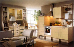 У некоторых производителей есть собственные идеи, как связать две разные по своему назначению зоны. Например, в кухонных гарнитурах Sie-Matic есть витрина-буфет, представляющая собой некое связующее звено между кухней и гостиной: в торце. Что ближе к кухне, хранится разная утварь, а отделение со стороны гостиной предназначено для праздничной посуды и сувениров.