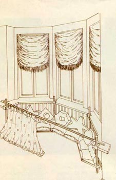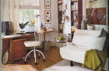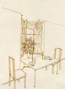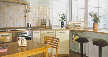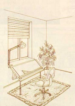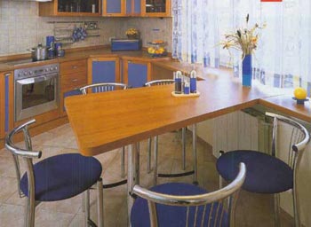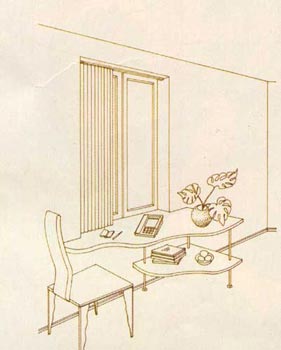 Бывают квартиры с небольшим угловым окном, подоконниккоторого также может быть превращен в стол. Столешницас одной опорой, заполняющая угол, создает треугольныйстол, а если его "нарастить" квадратом, то получитсяполноценный обеденный стол. В случае надобности в оконномуглу можно устроить просмотровый или копировальный стол.