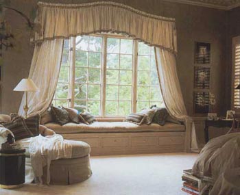 Подоконник-ложе возможен скорее в домах с индивидуальнойпланировкой с большими окнами, доходящими почти до пола.В основании такого ложе можно устраивать ящики для храненияпостельных принадлежностей, белья, одежды.