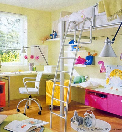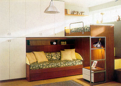 В такой мебели встречается откидная кровать, встраиваемаяв стенку, которая днем убирается. Если детей двое, можноиспользовать двухъярусную кровать или конструкцию, вкоторой кровати интегрированы одна в другую. В небольшойкомнате можно прибегнуть и к такому решению: днем однакровать устанавливается на другую с помощью специальногокрепления, освобождая игровое пространство, а на ночьвозвращается на место. Чтобы мебель было легче двигать,некоторые производители предлагают модели на колесиках.