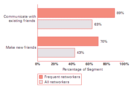 На данном графике сравниваются пользователи, которые регулярно обращаются к интернету и социальным сайтам с целью познакомиться и пообщаться со старыми друзьями ("frequent networkers"), и пользователи, которые постоянно пользуются социальными проектами (all networkers).