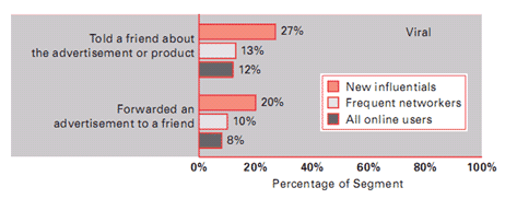 Во второй части графика представлено, сколько пользователей интернета заводят новые знакомства онлайн (70% и 43%). Новыми друзьями становятся люди, которые, возможно, никогда не увидятся в реальной жизни. Однако влияние виртуальных знакомых столь же сильно, что и влияние друзей из «плоти и крови». Широкий круг влияния можно сформировать, позиционируя себя как профессионала в определенной области, например, в своем блоге. Таким образом, общаясь с посетителями блога, данный пользователь при грамотном поведении может заработать себе авторитет и доверие.