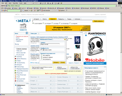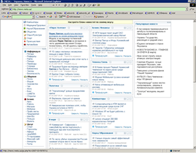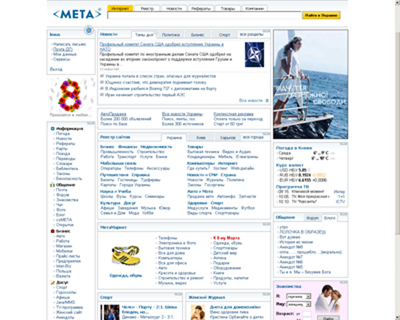 В Украине понимание принципов web 2.0 продемонстрировал один из авторитетнейших украинских порталов МЕТА. В прошлом году МЕТА отдала дань модным тенденциям и сделала коренную реконструкцию. Портал 2.0 Самые заметные изменения произошли на главной странице. Главные блоки стали заметнее, а посетители получили возможность настраивать страницу по своему вкусу. Страницу разделили на отдельные блоки. В правом верхнем углу каждого блока находится кнопка, позволяющая свернуть и больше не загружать блок. Это избавляет от не нужной в данный момент информации, и, кроме этого, делает загрузку более быстрой.