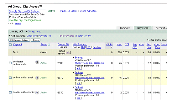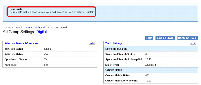 Объявления и ключевые слова также, как и в Yahoo! Search Marketing, прежде чем попасть на страницу поиска, должны пройти модерацию (в течение 24 часов).