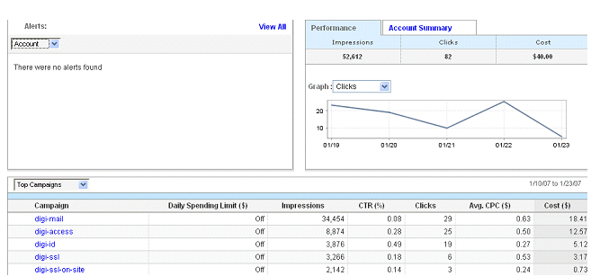 На скриншоте мы видим основное окно интерфейса AdWords, где можно посмотреть статистику за выбранный период: расходы, количество переходов, количество показов по каждой из рекламных кампаний и по аккаунту в сумме. В каждой кампании может быть созданы одна или несколько рекламных групп, для которых указывается список ключевых слов и объявлений.